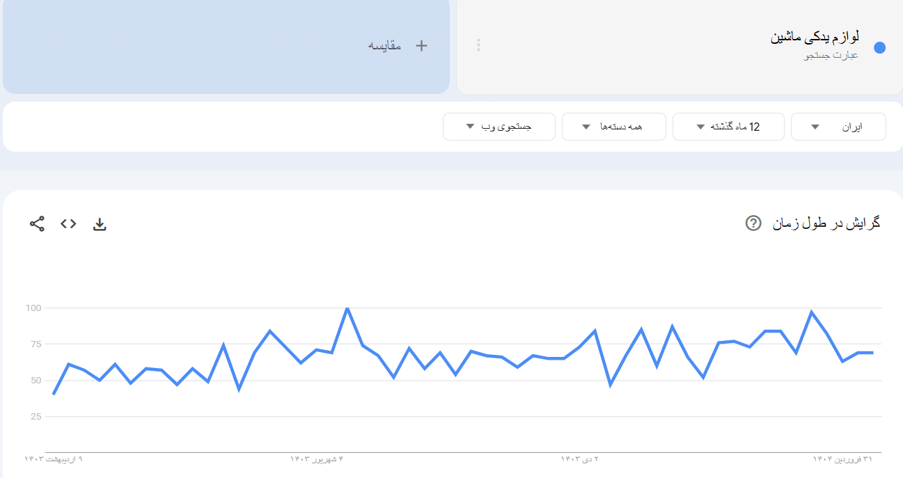طبق آمار گوگل ترندز، کلماتی مانند “قطعات یدکی خودرو”، “فروش لوازم یدکی ماشین” و “لوازم یدکی اصلی ماشین” از جمله عبارات پرجستجو و مرتبط با کلمه کلیدی اصلی ما هستند.