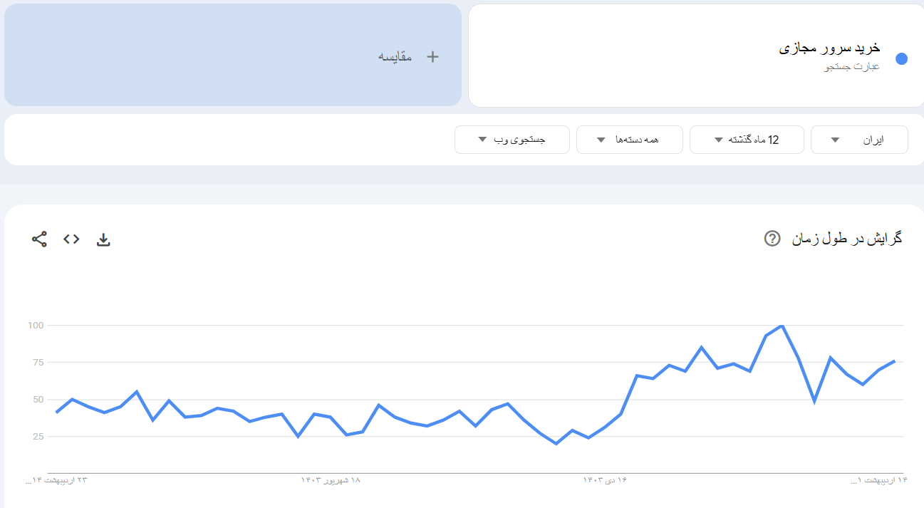قبل از هرگونه اقدامی برای خرید بک لینک، باید درک درستی از میزان جستجوی کلمه کلیدی “خرید سرور مجازی” داشته باشیم. برای این منظور، ابزار گوگل ترندز بهترین گزینه است که میزان جستجوی روزانه این کلمه کلیدی را نشان می دهد. با بررسی دقیق این آمار متوجه می شویم که این کلمه کلیدی از محبوبیت بالایی برخوردار است و کاربران زیادی به دنبال خرید سرور مجازی در موتورهای جستجو هستند.