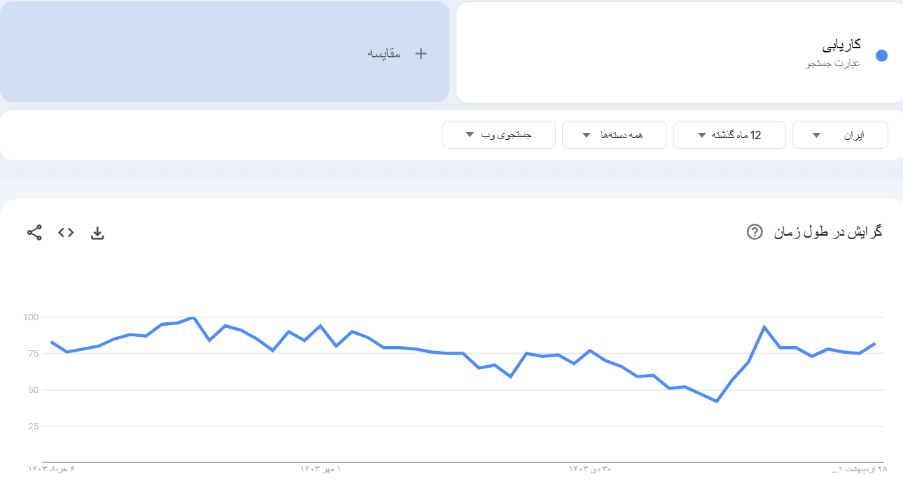 بر اساس آمارهای این ابزار، جستجوی کلمه کاریابی در ماه های پایانی سال و ابتدای سال جدید افزایش قابل ملاحظه ای پیدا می کند که نشان دهنده تمایل بیشتر افراد برای تغییر شغل در این مقاطع زمانی است. درک این الگوها به شما کمک می کند تا زمان بندی مناسبی برای بک لینک سازی و اجرای کمپین های تبلیغاتی داشته باشید.