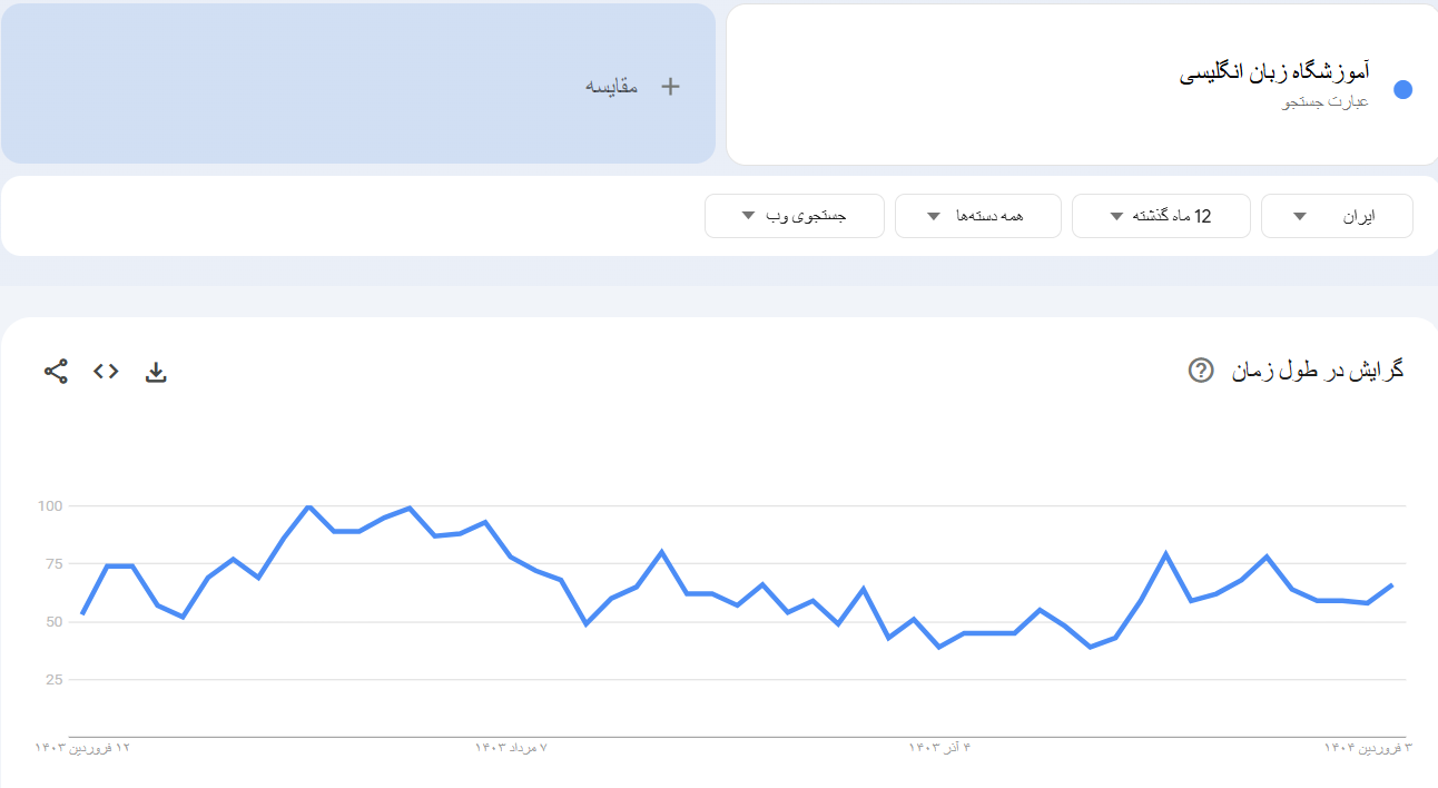 همچنین طبق آمار گوگل ترند، میزان جستجوی کلمه کلیدی “آموزشگاه زبان انگلیسی” در ماه های شهریور و مهر (شروع سال تحصیلی) و همچنین در اواخر اسفند و اوایل فروردین (شروع سال جدید) افزایش چشمگیری پیدا می کند.