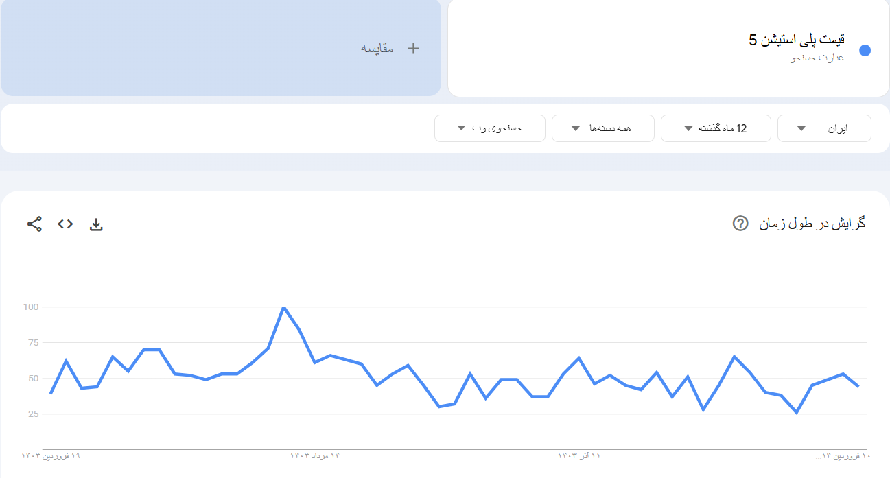با استفاده از ابزار گوگل ترندز می توانیم میزان محبوبیت کلمه کلیدی قیمت پلی استیشن 5 را در طول زمان بررسی کنیم. این ابزار نشان می دهد که این کلمه کلیدی یک روند صعودی را در جستجوهای ماهانه طی کرده است که نشان دهنده افزایش علاقه کاربران به این محصول است.