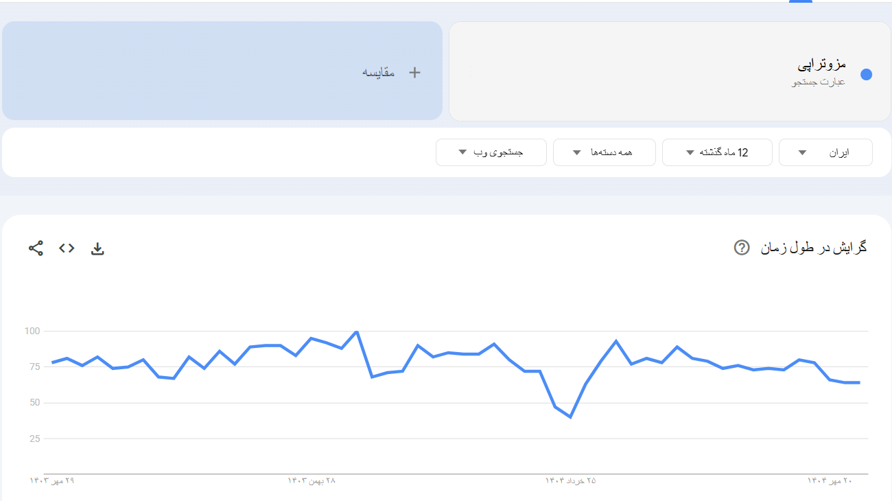 بررسی گوگل ترندز نشان میدهد که جستجوی کلمه مزوتراپی در فصلهای خاص سال مانند بهار و تابستان افزایش مییابد. این اطلاعات به شما کمک میکند تا زمان مناسبی برای راهاندازی کمپین بک لینکسازی خود انتخاب کنید.
