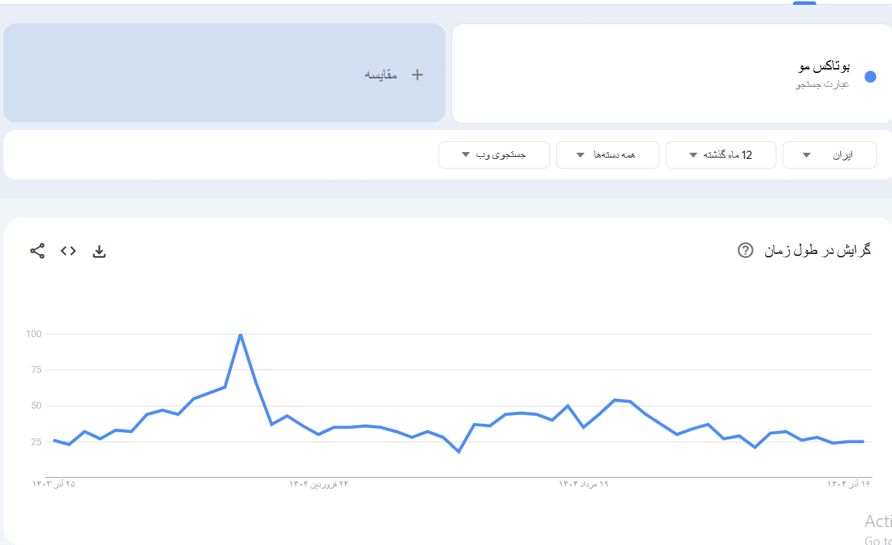 روند جستجوی «بوتاکس مو» در گوگل ترندز نیز نشاندهنده یک رشد صعودی و پایدار است. این ابزار به ما نشان میدهد که علاقه کاربران به این موضوع در بازههای زمانی مختلف، به خصوص در مناسبتها و فصول خاص، افزایش مییابد.